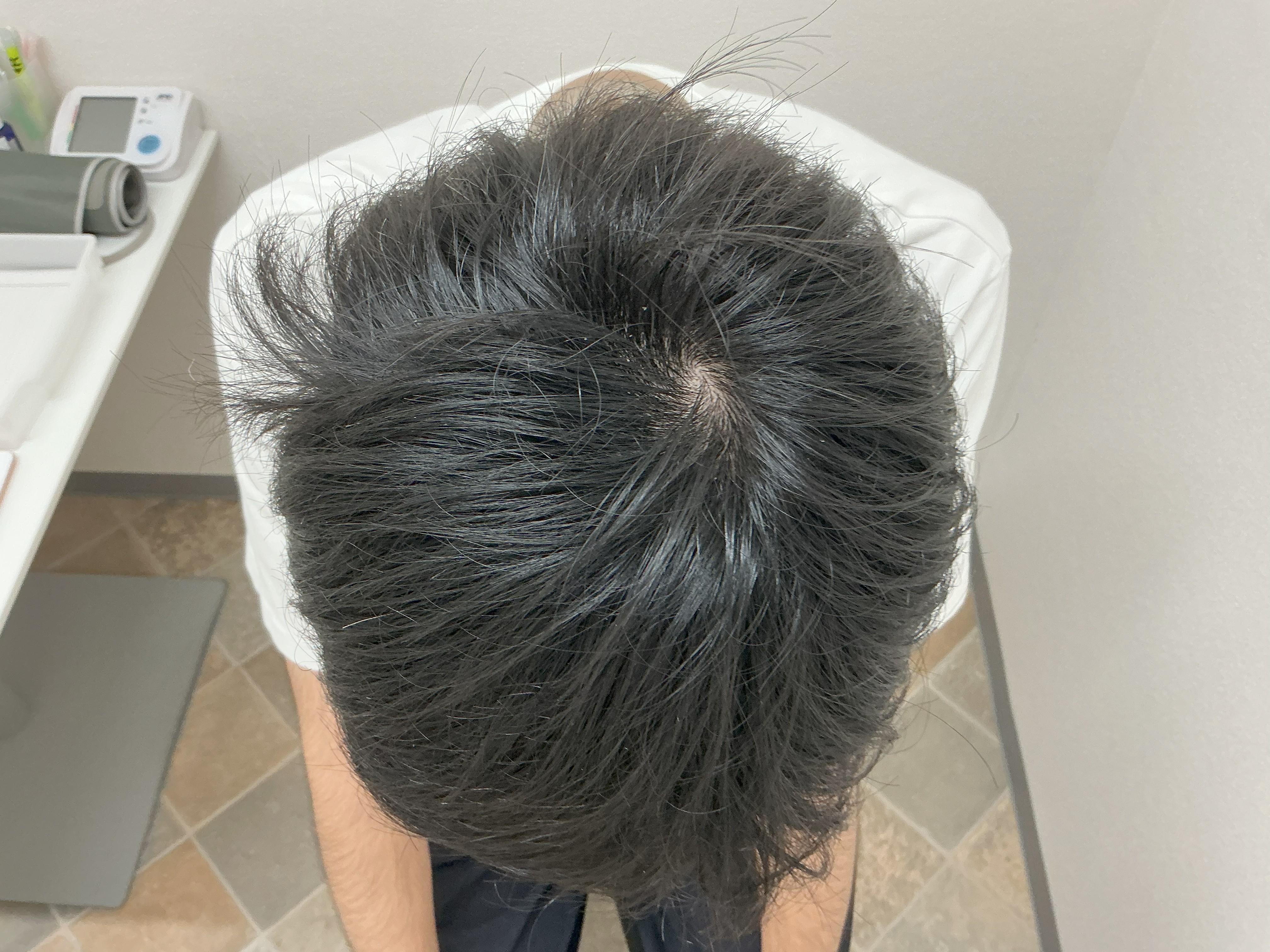 この患者様は会社の同僚の方からM字部分や頭頂部から前頭部にかけての薄毛を指摘されたことをきっかけに、薄毛を意識されるようになりました。当院に通院中の先輩の方からご紹介を受け『駅前AGAクリニック広島院』へご来院されました。8ヵ月目には髪質がしっかりしてきたことで、ドライヤーで乾かした後に寝ぐせがつきやすくなり、直してもまた立ち上がってしまうなど、これまでとは違ったお悩みもお話しくださいました。医療脱毛を検討されていましたがAGAは進行型の疾患のため、先にAGA治療を開始することをおすすめしています。