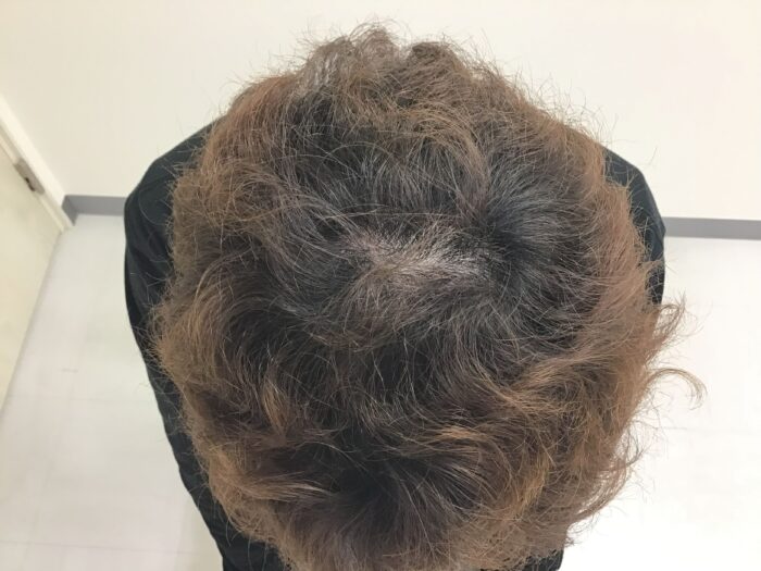 元々つむじ周りの密度は少なかったそうですが、徐々に生え際の後退と頭頂全体の密度低下を感じてきたようです。