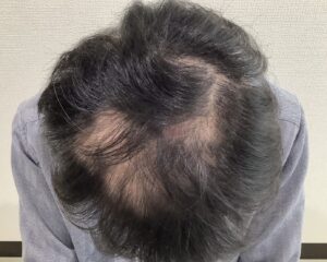 脱毛班は写真の箇所だけでなく頭部全体にあり、当院受診時も進行が続いていたため、多発型の円形脱毛症の急性期とAGAの併発型であると診断されました。