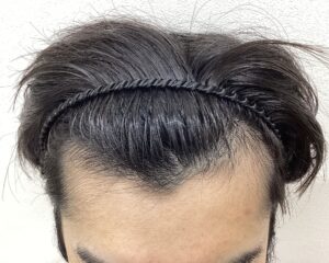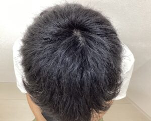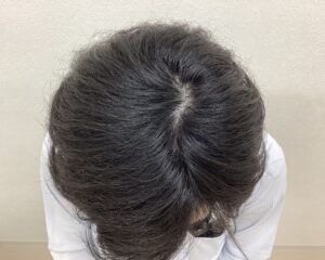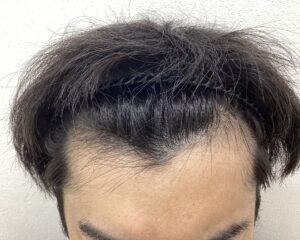 生え際M字の後退と頭頂部の分け目に透け感が見られました。