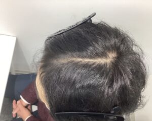 髪の毛1本1本が細く、全体のボリュームが出にくいため、スタイリングをしても頭皮が目立ちやすい状態でした。