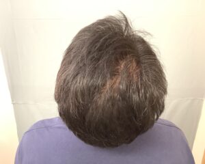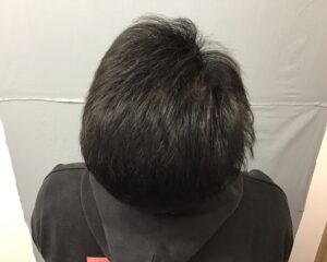 目立った副作用もなく、3カ月くらい経ったころから徐々に発毛効果が現れており、毛がしっかり太くなってきていました。気にされていた透けている状態も1本1本髪の毛がしっかりしているのでそういった部分もなくなっていて治療の効果がでているのがわかります。