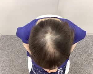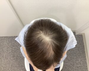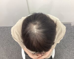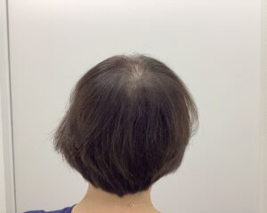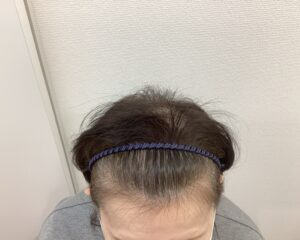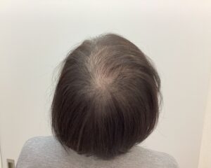治療開始当初は分け目から頭頂部にかけて地肌の透け感が目立っていましたが、治療開始後3ヶ月頃より抜け毛の減少と産毛の増加がみられました。