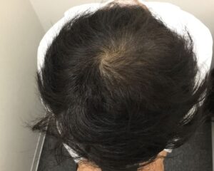 治療開始2ヵ月目には生え際の変化を確認されましたが、つむじ周辺はまだ頭皮の透け感が見られる状態でした。
