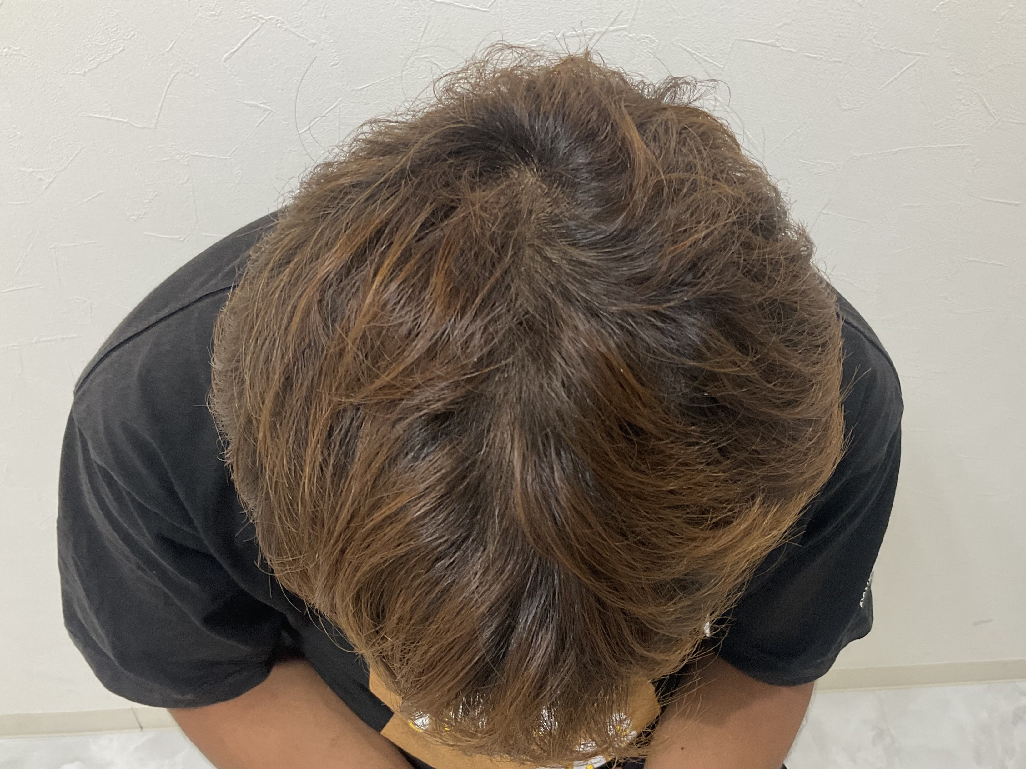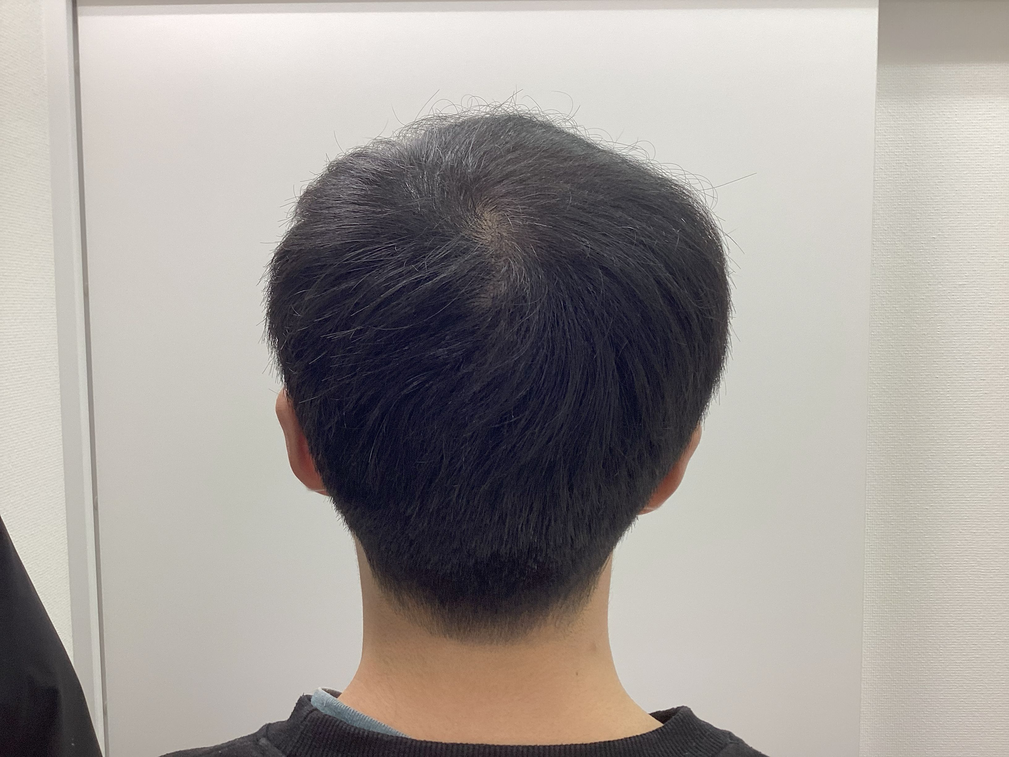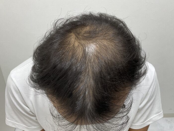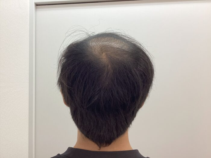 初診時所見(36歳男性 H-N分類 Ⅳ型)20代の頃から頭頂部の薄毛が悩みでした。ここ1~2年で更に頭皮が目立ち始めたので駅前AGAクリニック広島院に来院されました。写真で確認するとご自身が思っていた以上に進行していると実感されたようです。しっかり生やしたいと希望され治療を開始されました。